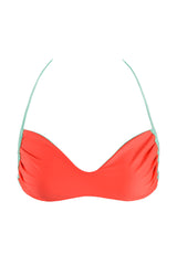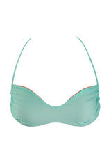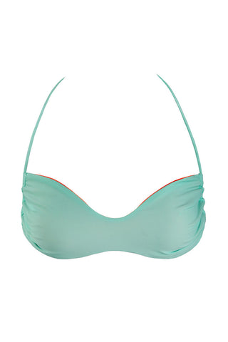 The drifter looks to let her hair down and ride off into the sunset. Get ready some epic tales on the beach with the daring Drifter Bikini Top in Reversible Mint & Coral by Kovey Swimwear!